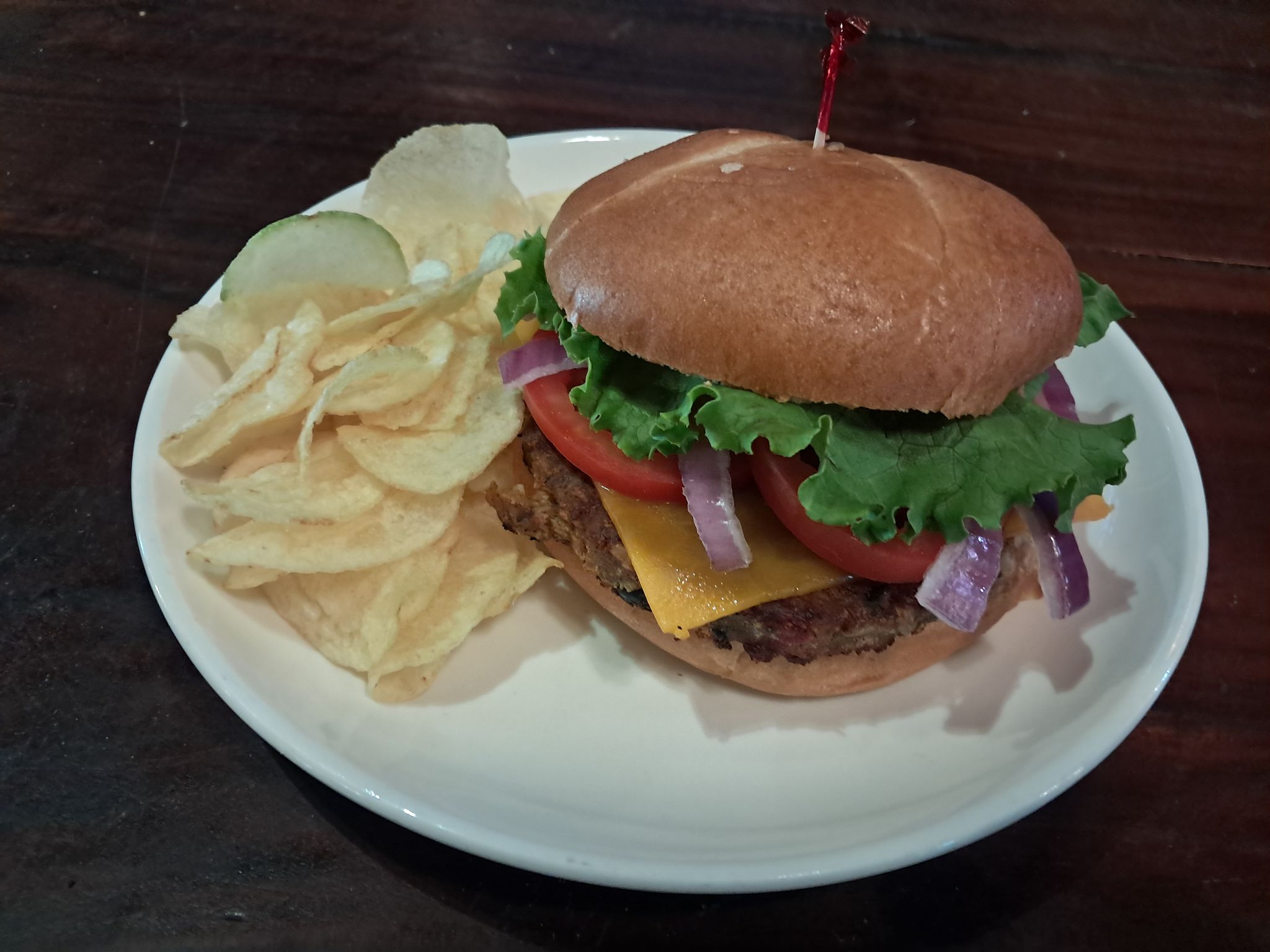 A meatless hamburger patty made from vegetables for a hearty alternative to beef. Served with lettuce, tomato, and onion, and your choice of mayonnaise or dressing on a Hawaiian roll.