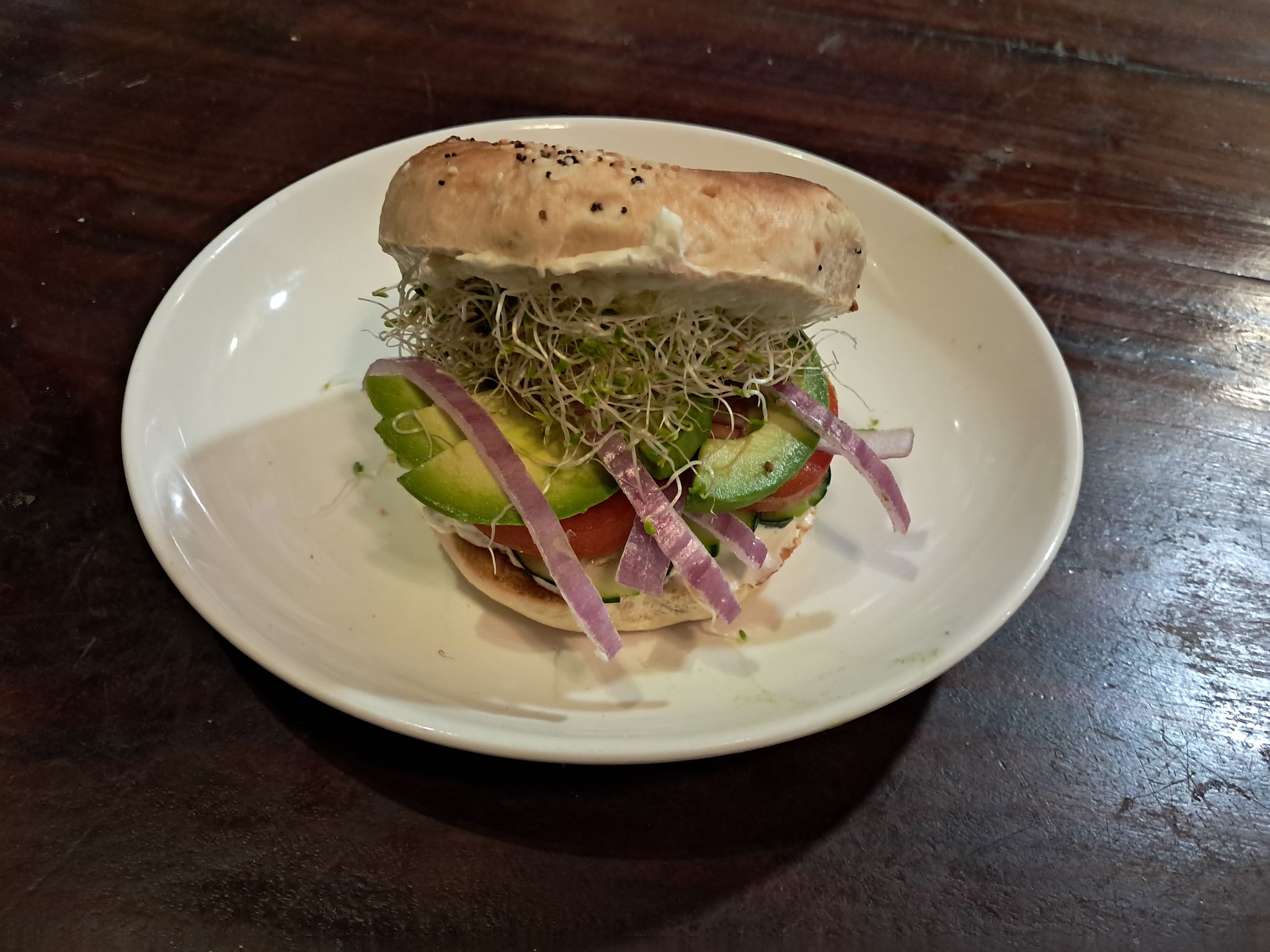 Toasted bagel of your choice with cream cheese, cucumber, tomato, red onion, avocado, and alfalfa sprouts.