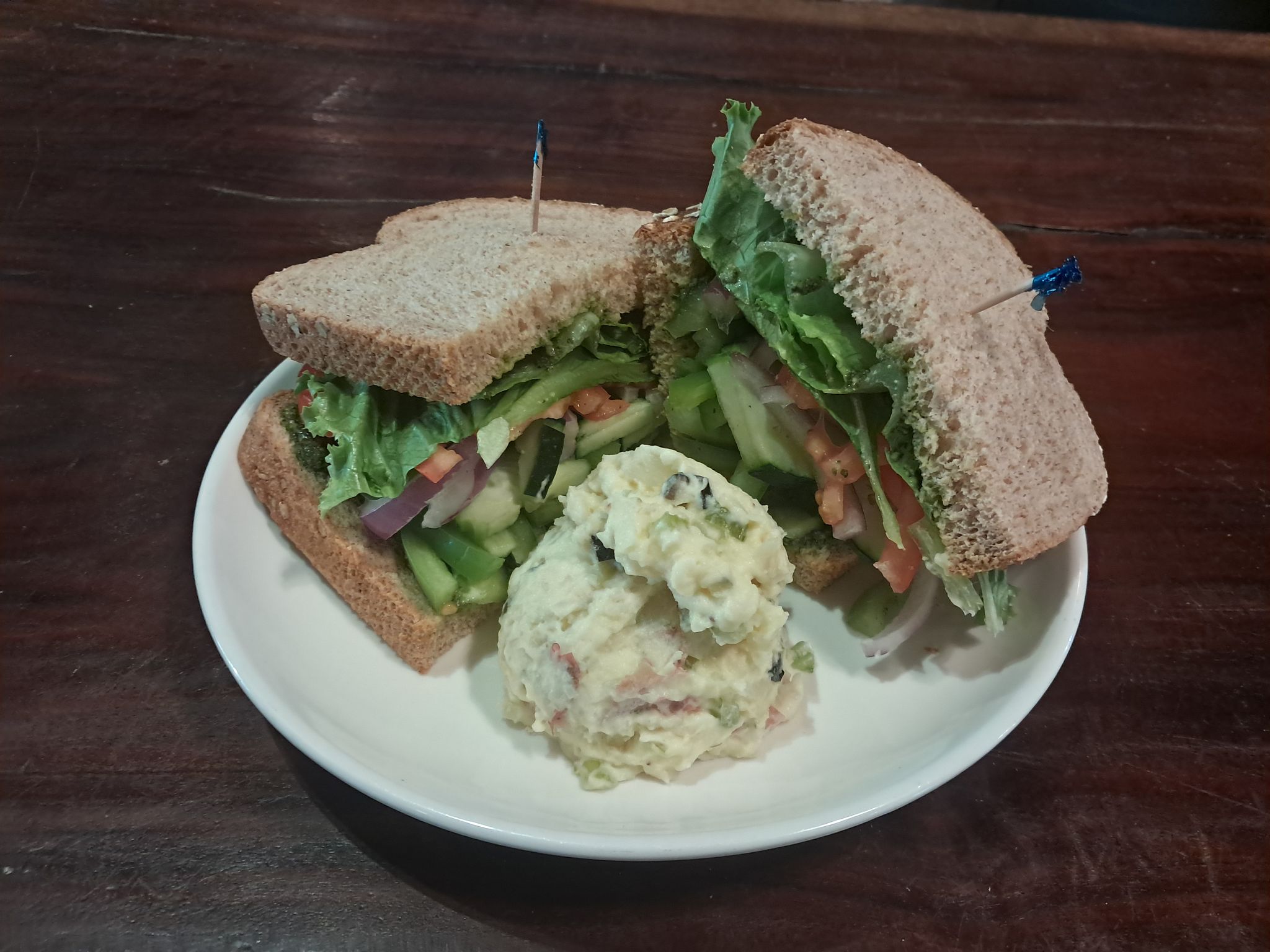 Lettuce, tomato, onion, cucumber, bell pepper, and your choice of cheese. Served with a basil spread on honey wheat bread. Cheese may be omitted for our vegan guests.